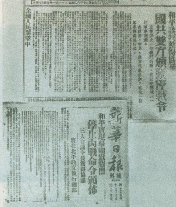 ↑1946年1月10日,《解放日報(bào)》和《新華日報(bào)》關(guān)于國共雙方頒布停戰(zhàn)令的報(bào)道。